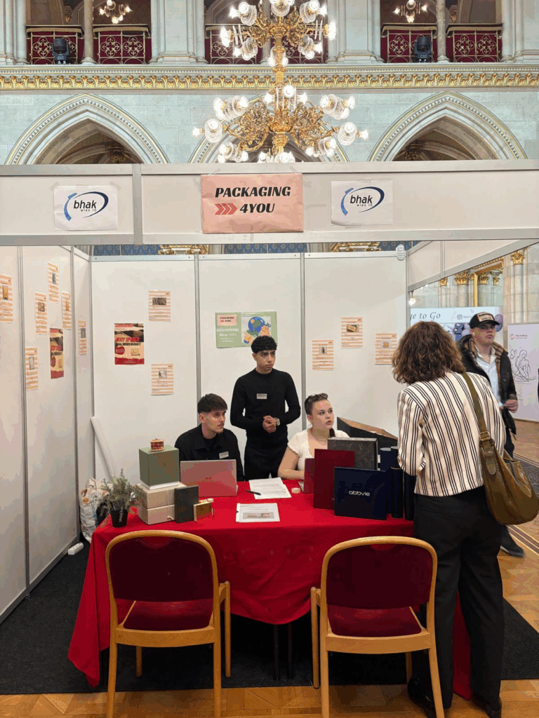 Am 10.03.2026 fand im Wiener Rathaus die internationale Übungsfirmen Messe statt, an der auch unsere Übungsfirma „Packaging4you“ teilgenommen hat. Die Messe bot uns eine großartige Möglichkeit, unser Unternehmen sowie unsere Produkte einem breiten Publikum zu präsentieren.